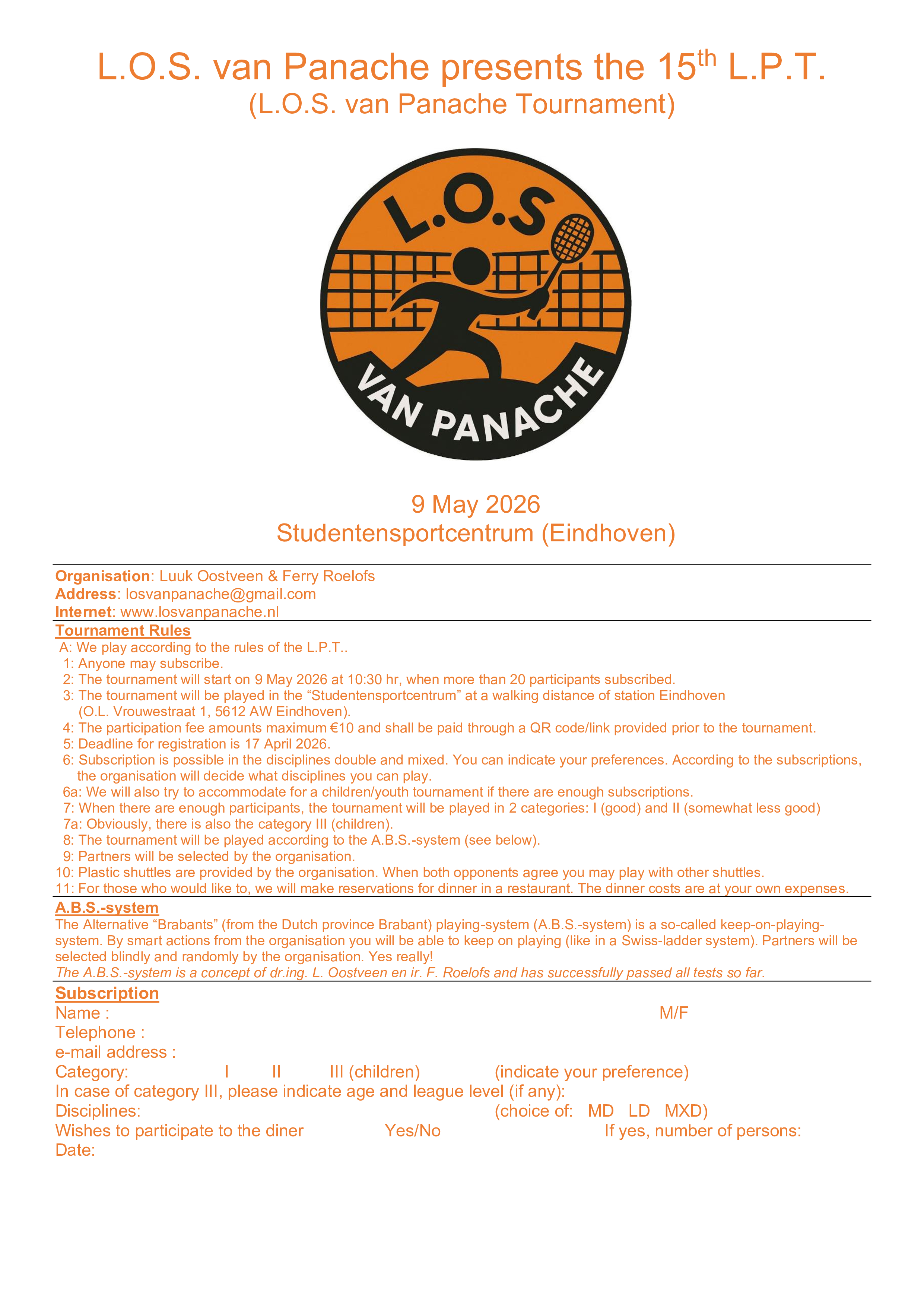 We gaan alweer naar de 12e editie van ons open toernooi alleen dit jaar niet alleen een mix toernooi maar ook een dubbel toernooi, van 3e divisie t/m recreanten.