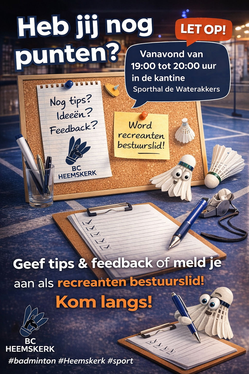 Heb je ideeΓ«n, tips of feedback voor BC Heemskerk? Of lijkt het je leuk om als recreanten bestuurslid mee te denken over onze vereniging?