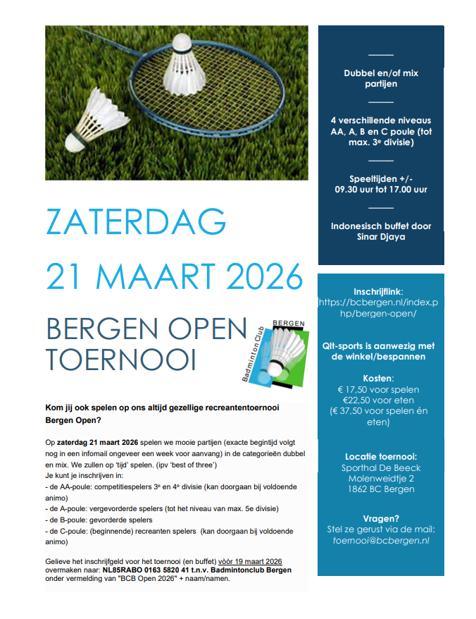 Ook dit jaar heeft BC Bergen weer hun jaarlijkse Bergen open Toernooi op de kaart staan.