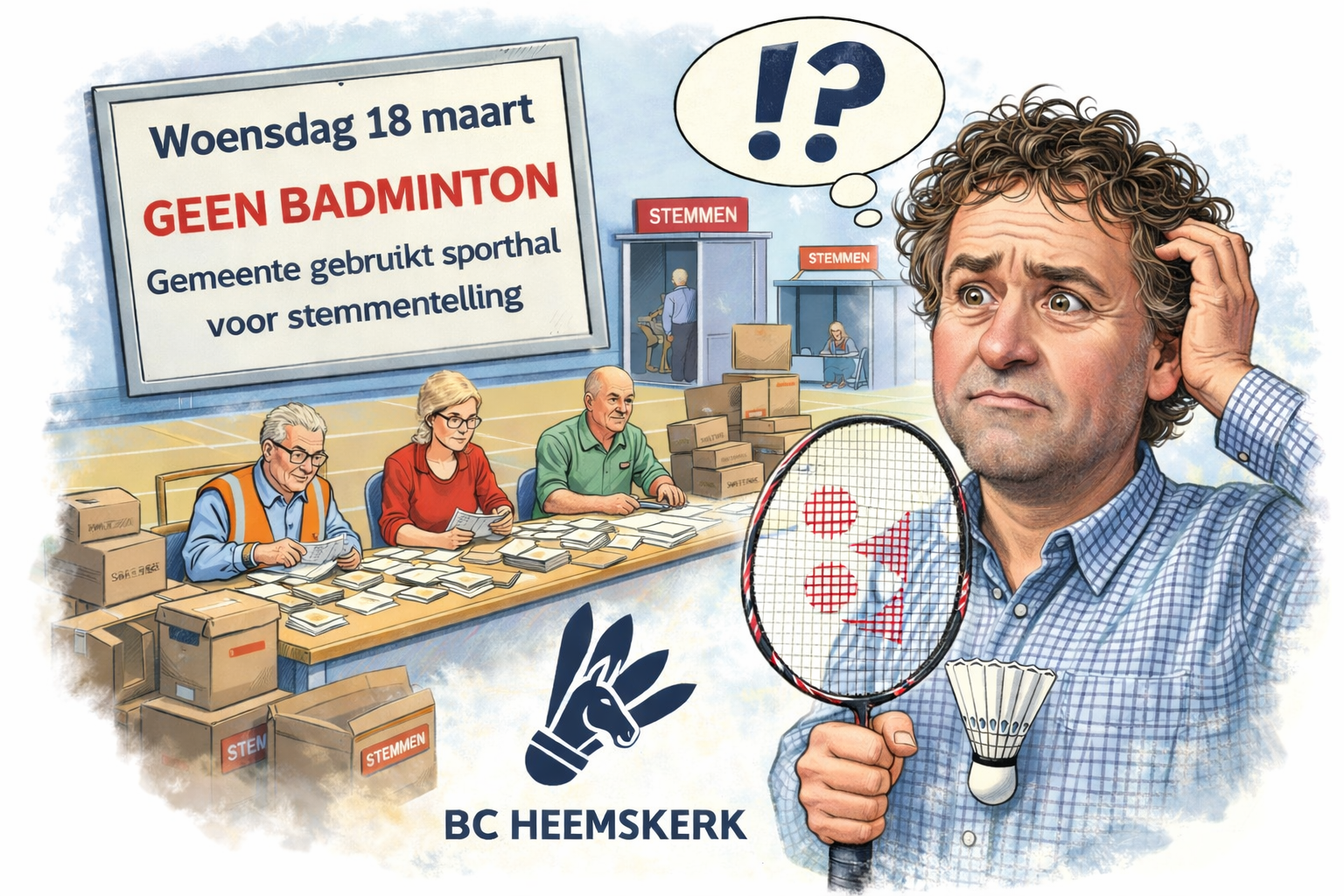 Alvast een herinnering dat er aankomende woensdag geen badmintonnen is omdat de gemeente de hal nodig heeft om de stemmen te tellen.