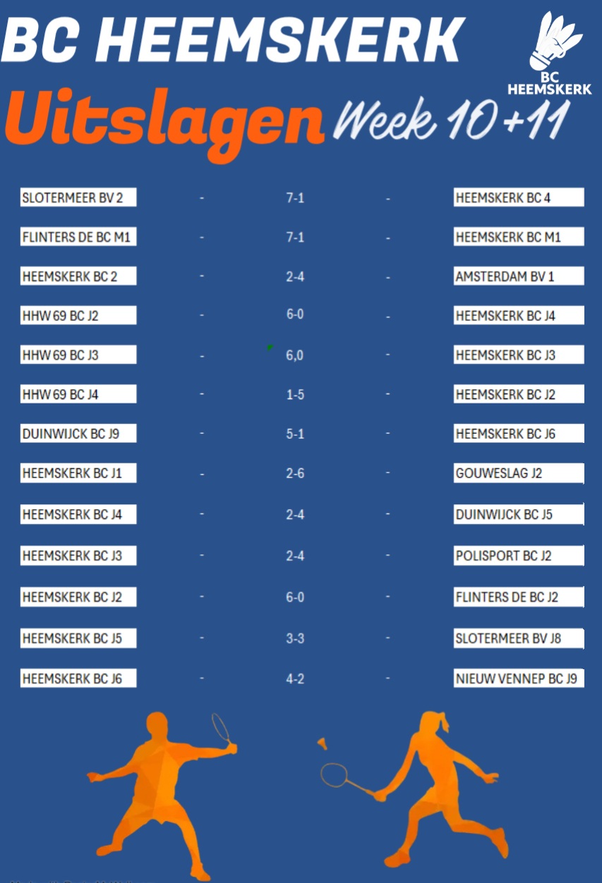 Een kleine achterstand maar hierbij toch nog de laatste uitslagen van de competitie van BC Heemskerk, de eerste uitslag van de voorjaars competitie en de uitslagen van de de jeugd competitie van de afgelopen 2 weken.